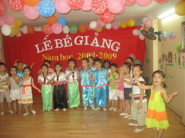Không khí buổi lễ bế giảng thật sôi động bằng các màn biểu diễn văn nghệ đặc sắc. Nina của mẹ được hát cả tiếng Anh cùng các anh chị lớn nữa. Oai phết. Cookies cookies one two three, one for you, one for me...Con phát âm rất chuẩn và động tác cũng đều theo nhịp.